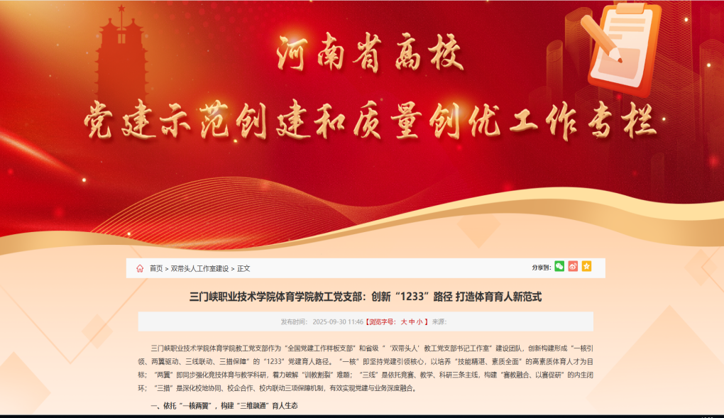 2025年,体育学院教工党支部作为“全国党建工作样板支部”,创新构建“一核引领、两翼驱动、三线联动、三措保障”的“1233”党建育人新范式。其创新实践与显著成果获得“大河报”、省教育厅官方网站等省级官方媒体的专题报道,产生了积极的示范效应。