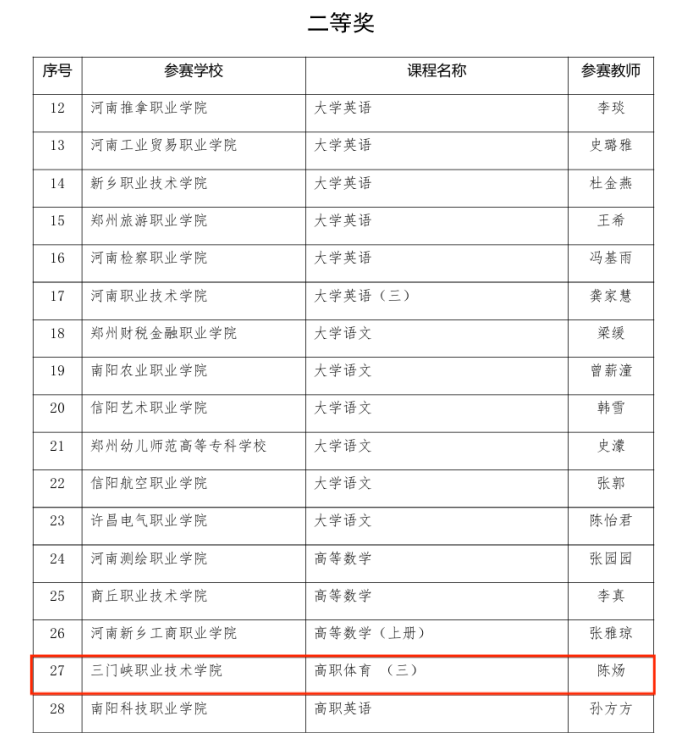 近日,2025年河南省高等职业教育课堂教学创新大赛公共基础组现场竞赛在济源职业技术学院落下帷幕。体育学院教师陈炀历经学校竞赛、网络初评、现场竞技等多轮角逐,最终荣获公共基础组二等奖,这一成绩的取得,离不开学院领导的高度重视与指导教师团队的倾力指导。